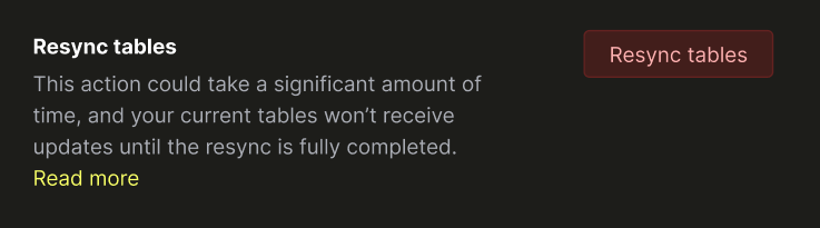 - Вам может понадобиться выполнить значительные изменения схемы в исходных таблицах, которые поломают существующий ClickPipe, и его пришлось бы перезапускать. В этом случае вы можете просто нажать Resync после внесения изменений.